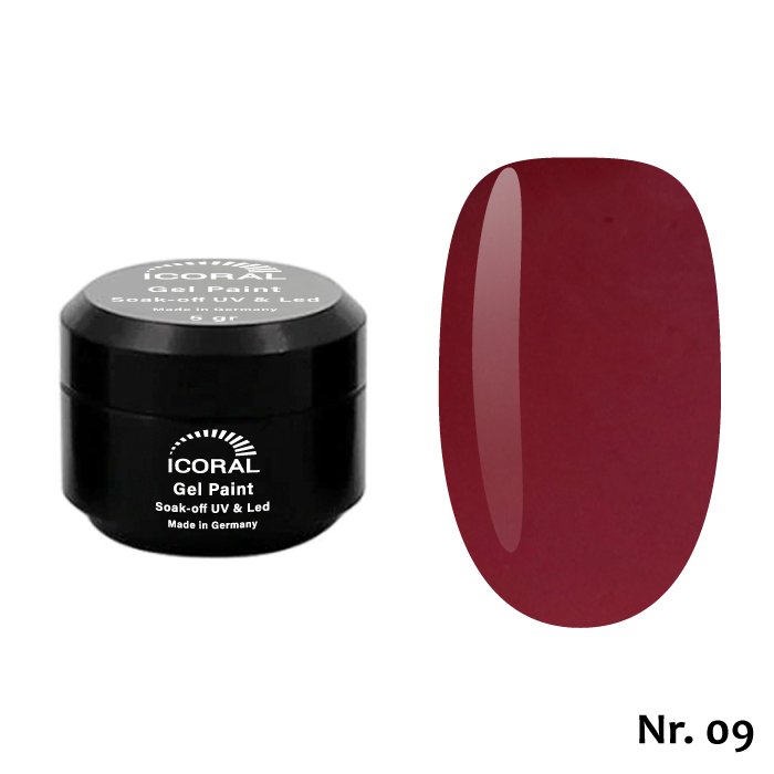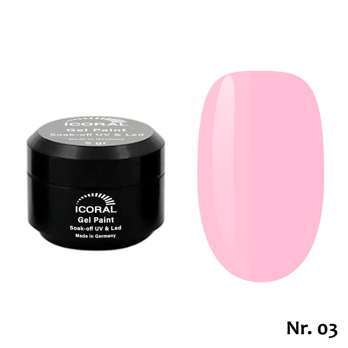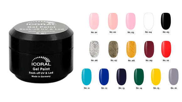 Gel Paint ICORAL este un gel color de o pigmentatie intensă, special conceput pentru picturile pe unghii. Se poate folosi și pentru aplicarea pe toată suprafața unghiei, si pentru french colorat. Se aplică ușor, într-un singur strat. Poate fi aplicat si peste top. Deoarece conțin pigment, se recomandă a se amesteca cu o spatulă sau un bețișor de portocal înainte de utilizare.
